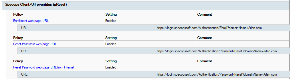 Windows Registry Editor Version 5.00 [HKEY_LOCAL_MACHINE\SOFTWARE\SpecopsSoft] [HKEY_LOCAL_MACHINE\SOFTWARE\SpecopsSoft\uReset] [HKEY_LOCAL_MACHINE\SOFTWARE\SpecopsSoft\uReset\Client] [HKEY_LOCAL_MACHINE\SOFTWARE\SpecopsSoft\uReset\Client\Urls] "Enroll"="https://login.specopssoft.com/Authentication/Enroll?domainName=specopsdemo.com" "Reset"="https://login.specopssoft.com/Authentication/Password/Reset?domainName=specopsdemo.com" "ResetExternal"="https://login.specopssoft.com/Authentication/Password/Reset?domainName=specopsdemo.com"