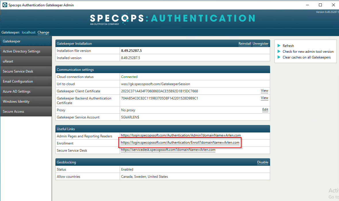 Launch Specops Authentication Gatekeeper Administration from the start menu on your Gatekeeper server. Identify the Enrollment URL under Useful Links, and right-click on it to copy it to a temporary location: